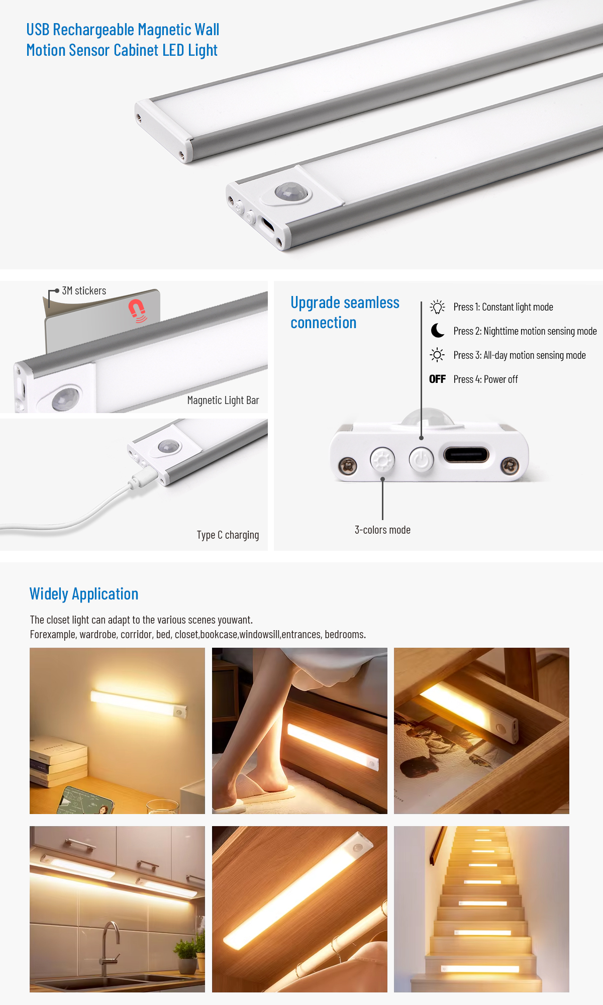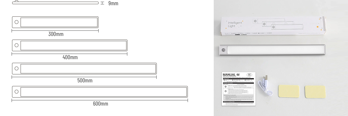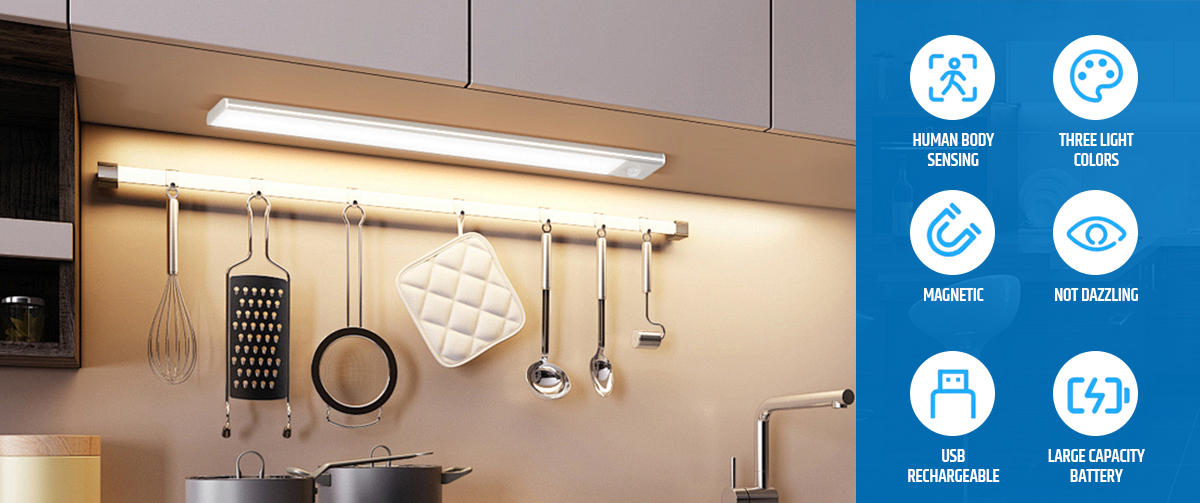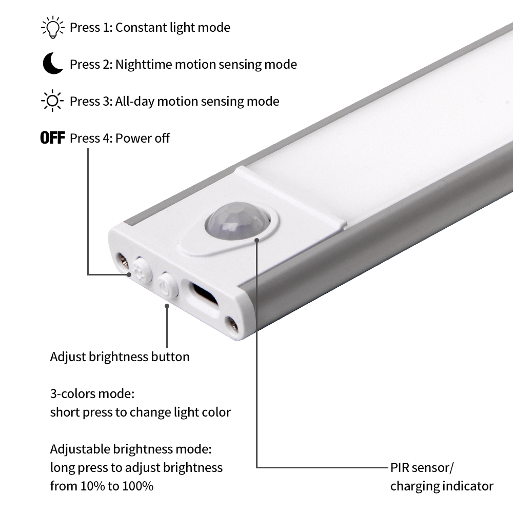 This versatile LED under-cabinet light offers easy and energy-efficient illumination with a built-in motion sensor, 3‑CCT selectable color temperatures, and dimmable brightness.Fully battery powered and rechargeable, it's ideal for installation in cabinets, closets, shelves, and other areas without existing wiring—meeting modern lighting needs with convenience and style.