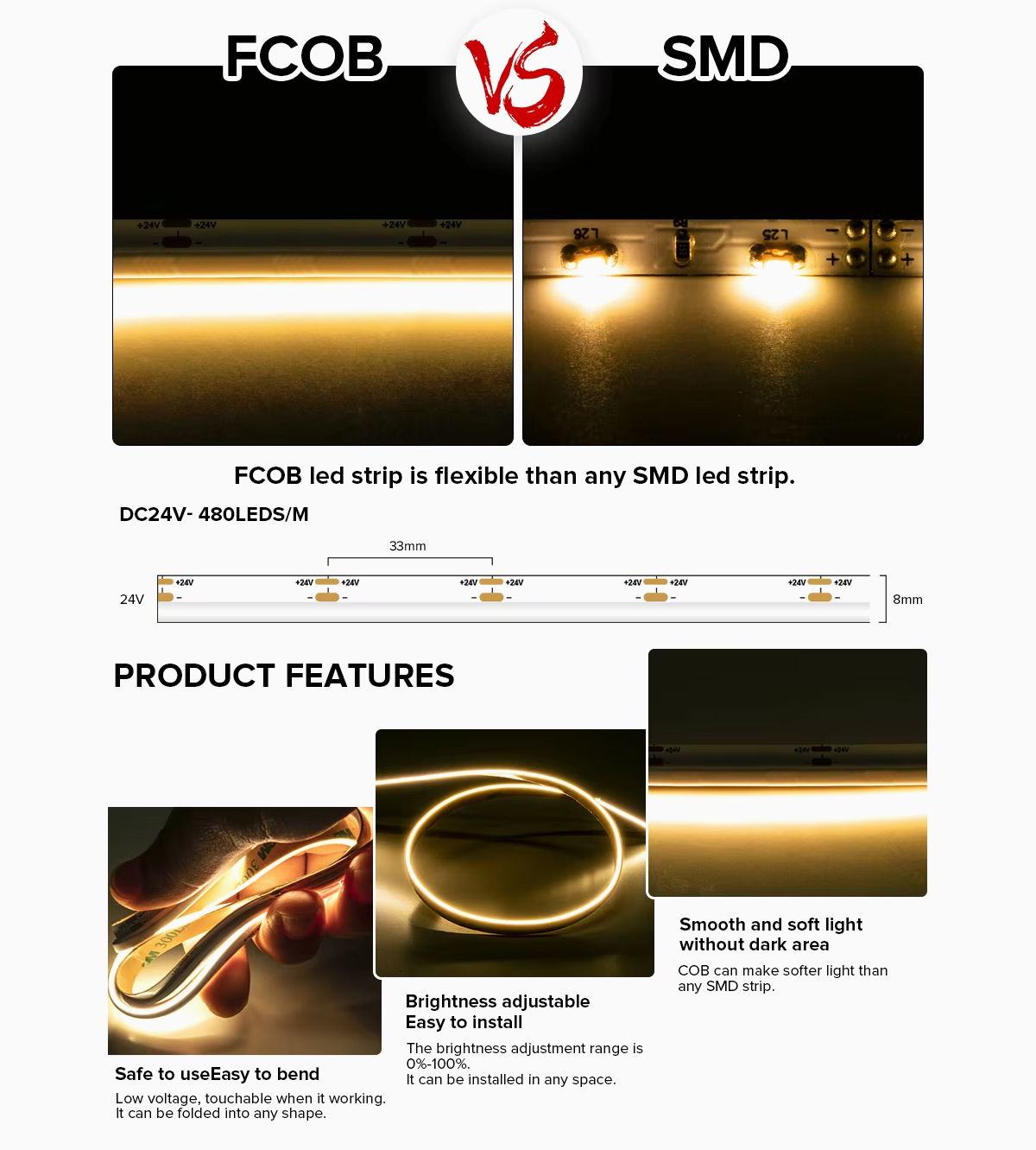 The structure of the COB LED Flexible Strip Lights emphasizes both compactness and adaptability. By combining high-density chips into a continuous light source, the design eliminates hotspots and reduces component complexity. The strips come in widths of 5mm, 8mm, 10mm, and 12mm, making them compatible with a broad range of fixtures and mounting channels. This modular approach allows easy customization for curved or confined spaces, supporting diverse installation needs while maintaining consistent light quality.