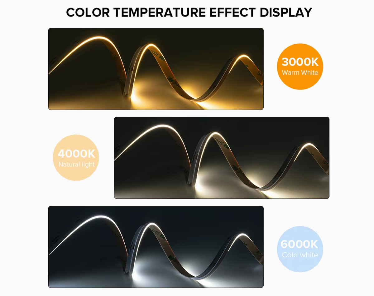 Under the hood, the COB LED Flexible Strip Lights use high-density LED chips arranged to create a flawless line of light with high efficiency—around 110 lumens per watt—and excellent color rendering above Ra 90. Operating on DC12V or DC24V, the strip features multiple width options and several color modes from single-color to tunable white, offering both precision and adaptability. Its long service life of up to 50,000 hours ensures lasting performance, while the flexible design supports installation in narrow or curved fixtures without compromising uniformity or brightness.