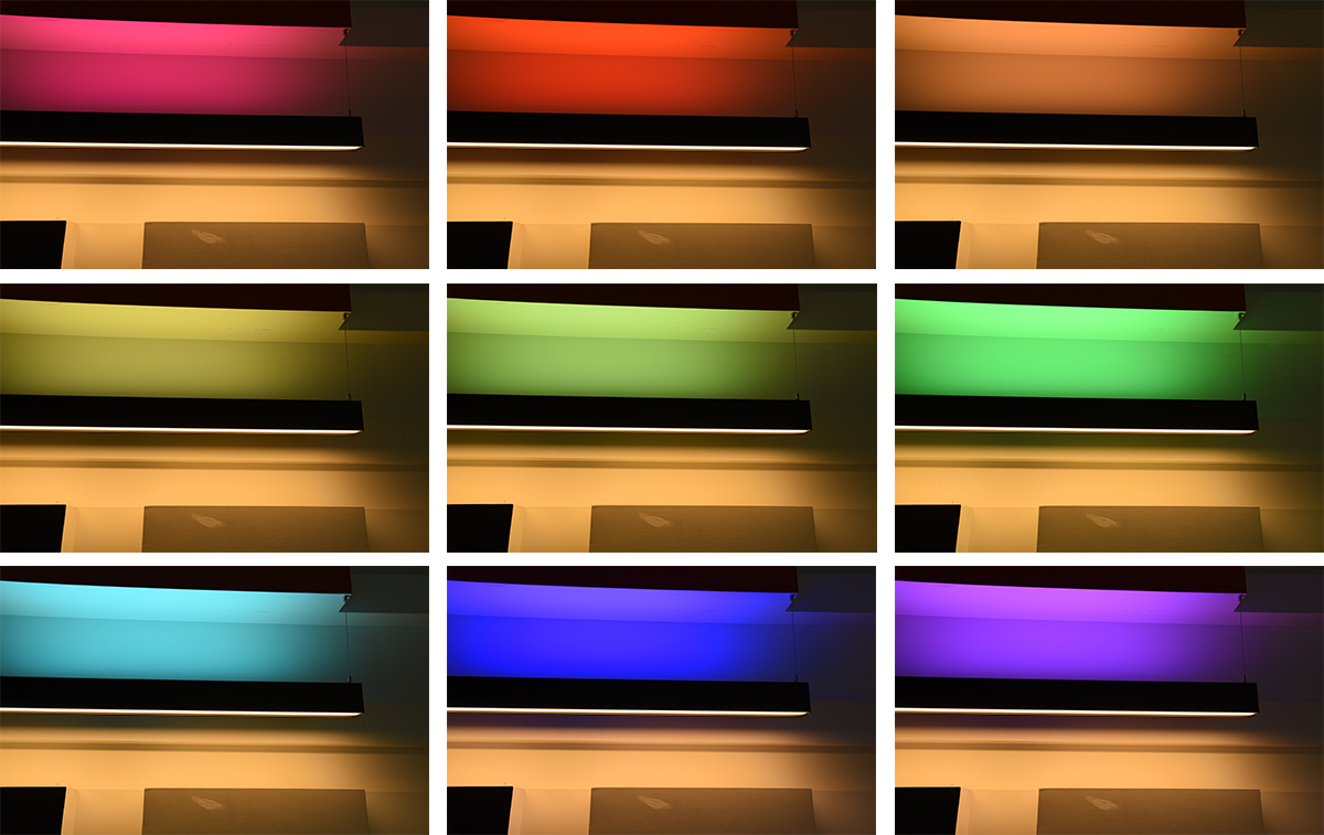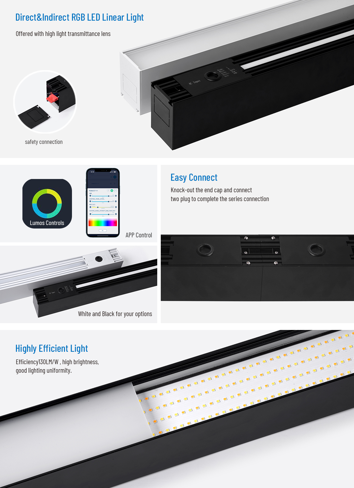 This RGB linear light supports 0-10V dimming and three switchable color temperatures . You can easily control it via a eight panel or mobile APP, allowing you to customize the lighting atmosphere as you wish.The high-transmittance PC cover provides soft visual comfort for demanding applications such as living room, coffee shop and hotel.