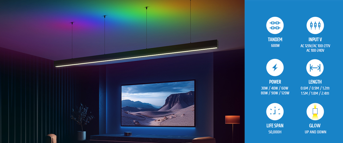 Equipped with 0-10V dimming and controlled via the Lumos Control APP, the LED Smart RGB Pendant Light offers seamless illumination adjustments and color tuning at your fingertips. Available in multiple lengths from 2ft to 8ft and wattage options ranging from 30W to 90W, this pendant accommodates various spatial and lighting needs. Constructed from durable PC and aluminum, it ensures long-lasting performance. Its frosted PC cover diffuses light softly, minimizing glare while providing smooth, uniform brightness. Certified by ETL, RCM, CE, and RoHS, it supports global voltage ranges ensuring safe, reliable operation worldwide.