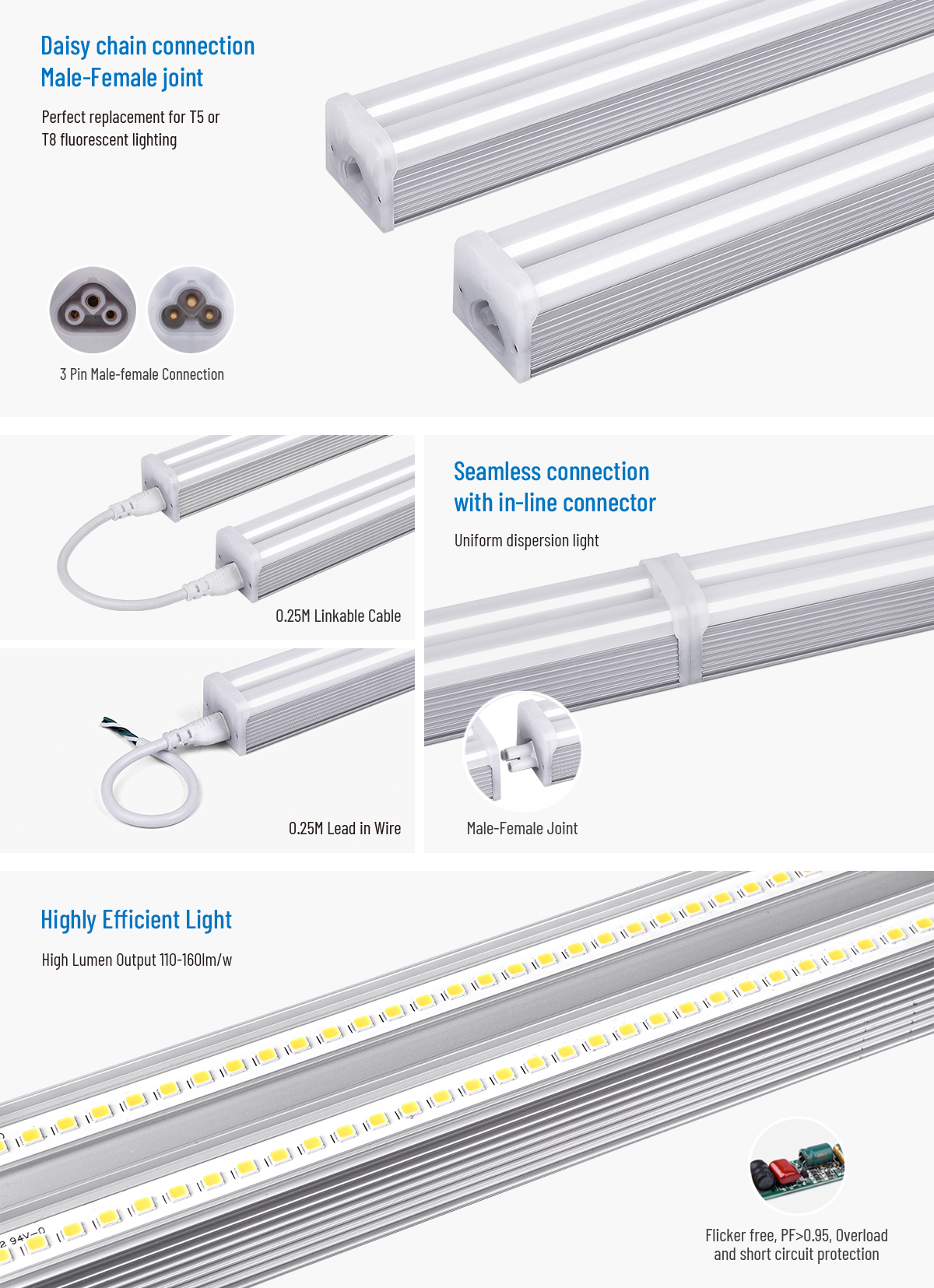 This LED tube is engineered with a patent male-female linkable design, allowing fixtures to be seamlessly connected in line for continuous, no-dark-spot lighting runs that are neat and efficient — perfect for large spaces such as warehouses, retail aisles, or offices. The durable aluminum housing and PC cover provide excellent heat dissipation and long-term reliability, while the internal driver and heat protection system ensure consistent performance even in demanding environments.