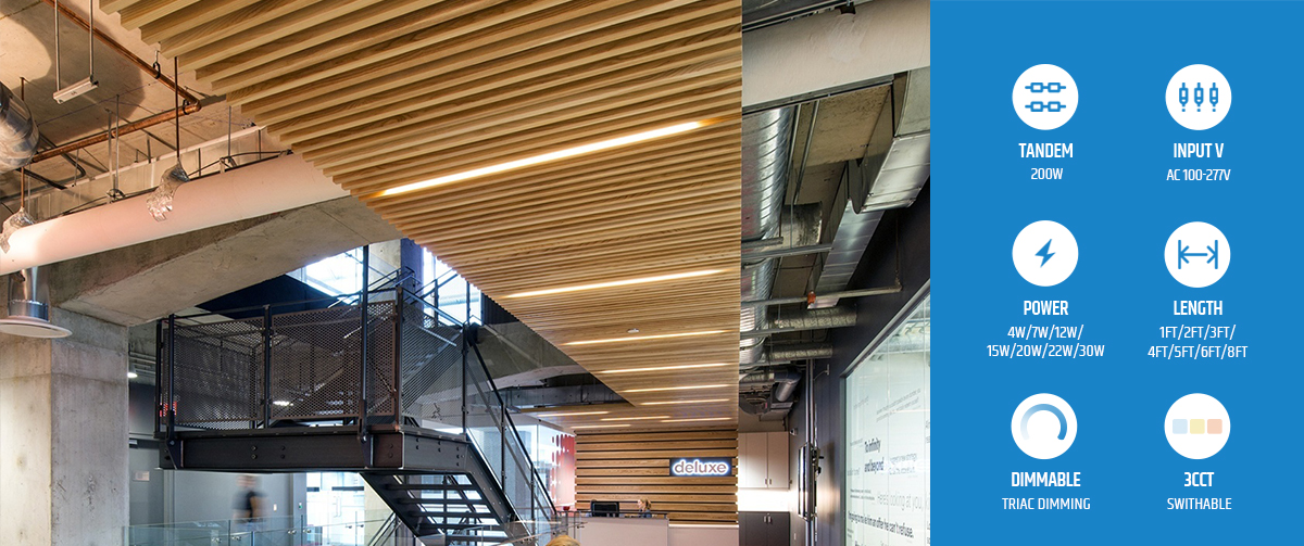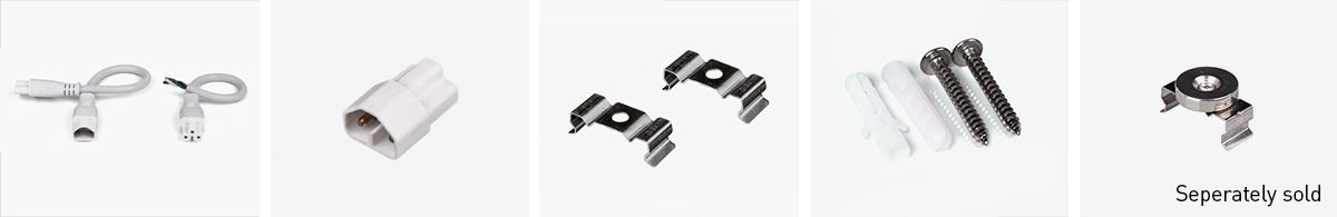 Available in 1-8ft length,, 4w-30W, 2700K-6500K CCT with power cord, connection cable, small connector, and mounting hardware included.