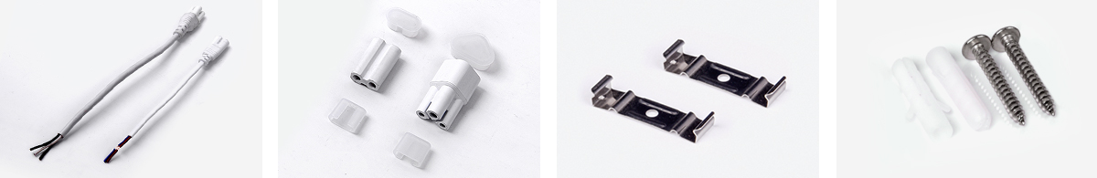 One 250mm power cord, one 250mm connection cable, one small connector, clips and screws...