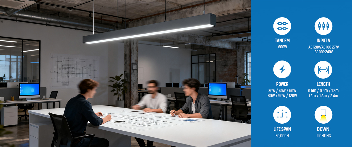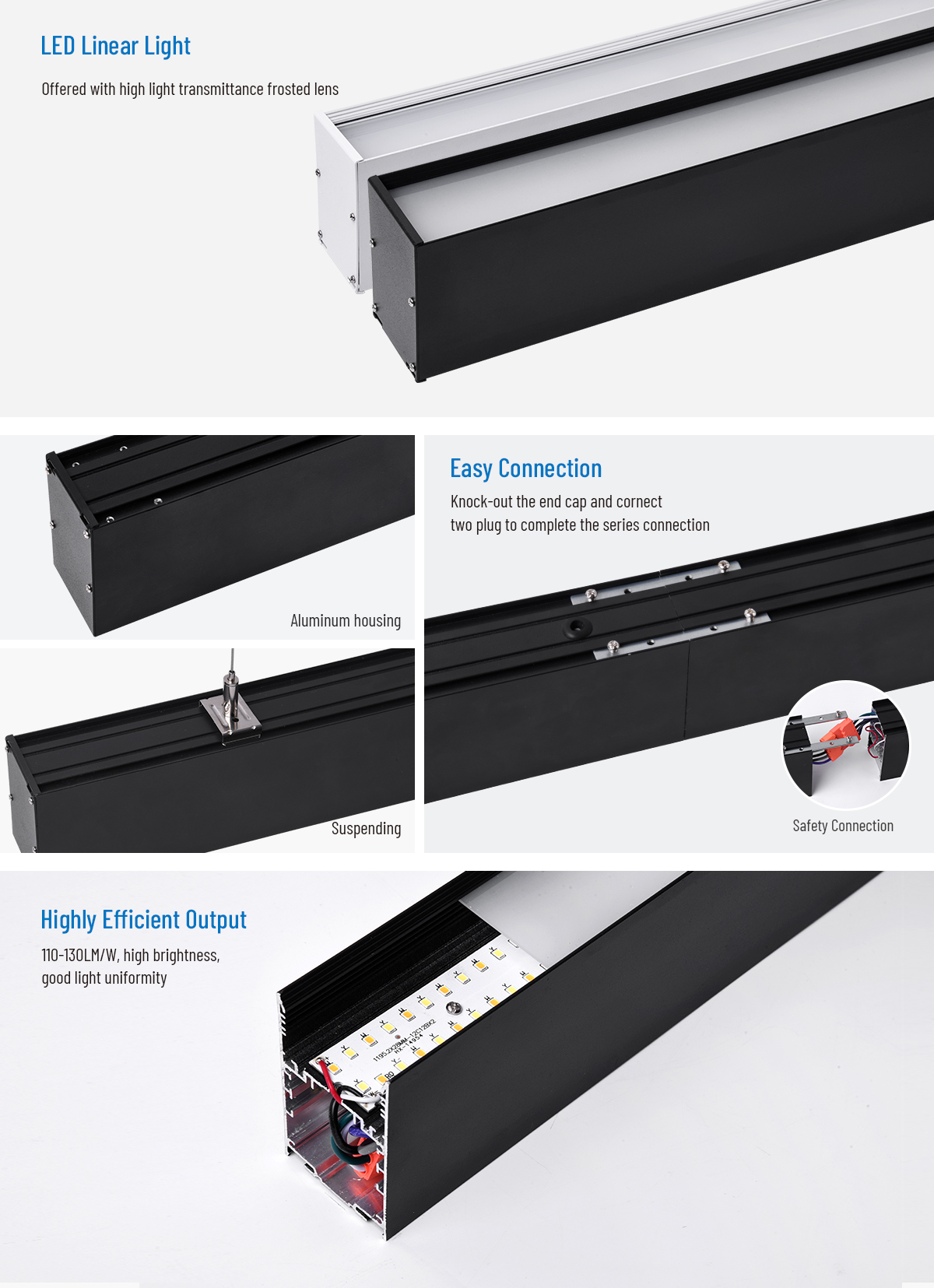 LED Linear Pendant Light is a modern and energy-efficient linear lighting solution designed for commercial as well as industrial applications. Featuring a clean linear profile and suspended installation, this fixture delivers uniform illumination while enhancing the architectural aesthetics of interior spaces. With high-efficiency LED technology and reliable performance, it is an ideal choice for offices, retail environments, and public buildings for your projects. The LED Linear Pendant Light is designed to provide stable, high-quality illumination for a wide range of indoor applications. Equipped with high-efficiency LED chips and a reliable driver system, the fixture delivers bright yet soft light output, ensuring excellent visual comfort while reducing energy consumption. The housing is manufactured from high-grade aluminum, offering efficient heat dissipation and long-term durability. This structural design helps maintain consistent lighting performance and extends the lifespan of the LED linear light, making it suitable for continuous daily operation in commercial and professional environments. With multiple length, wattage, and color temperature options available, this LED linear pendant light can be customized to meet different project requirements. The suspended installation allows the luminaire to create clean, continuous lighting lines, contributing to a modern and organized visual appearance within the space. Advanced optical design ensures even light distribution and reduced glare, making the fixture ideal for workplaces and public areas where visual comfort is essential. Optional dimming and lighting control solutions are available, allowing integration into intelligent lighting systems for enhanced energy efficiency and flexible lighting control. As part of a professional linear lighting solution, the LED Linear Pendant Light complies with international quality and safety standards, making it suitable for global markets. Its modular design also simplifies installation and maintenance, helping to reduce overall project and operating costs. Key Features: