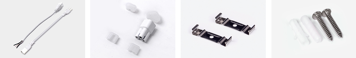 One 250mm power cord, one 250mm connection cable, one small connector, clips and screws...