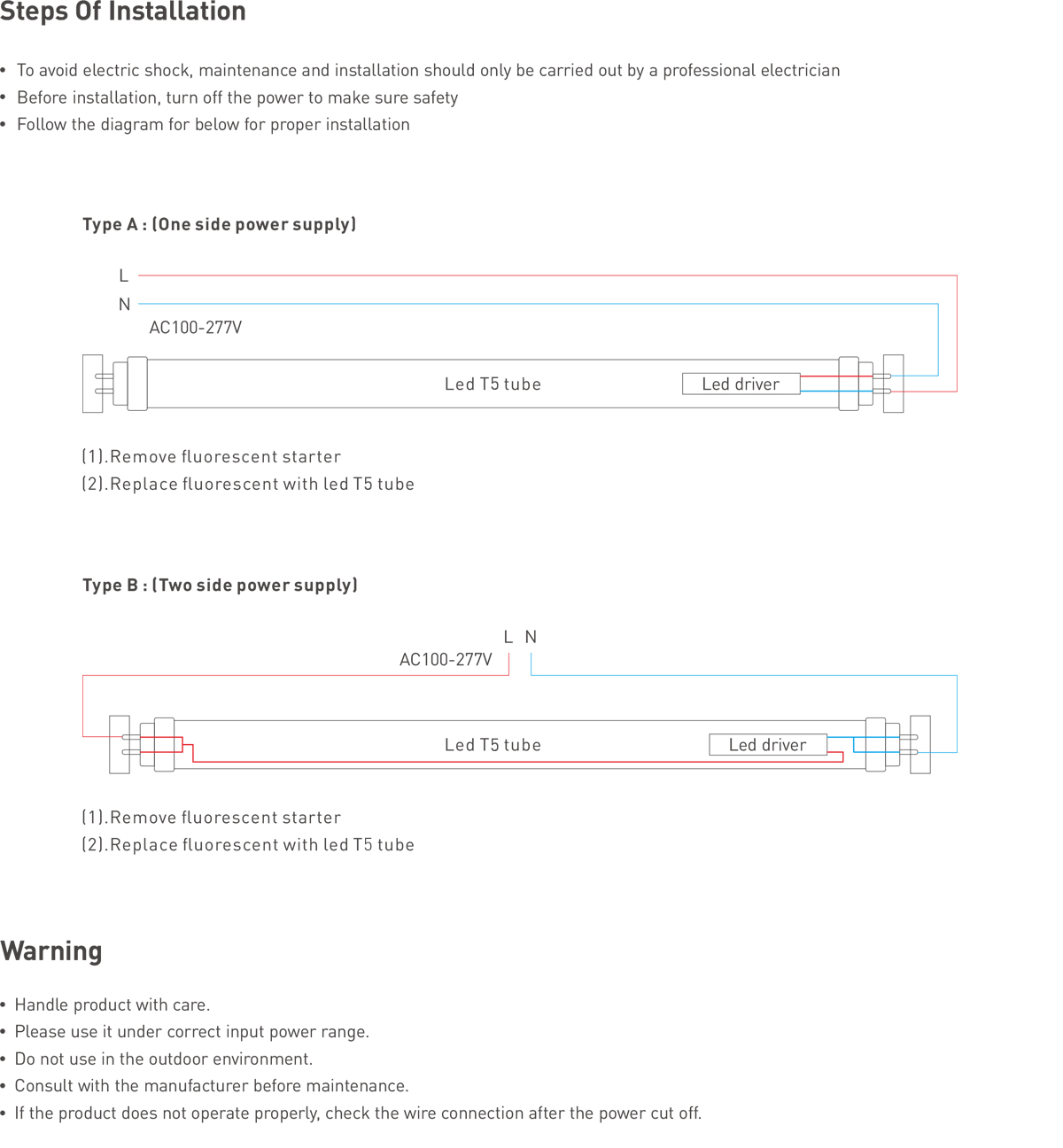 Installation is straightforward as the T5 LED Tube acts as a direct replacement for standard T5 fluorescent tubes. It fits existing fixtures without modification, facilitating quick upgrades to energy-saving LED lighting with minimal downtime.
